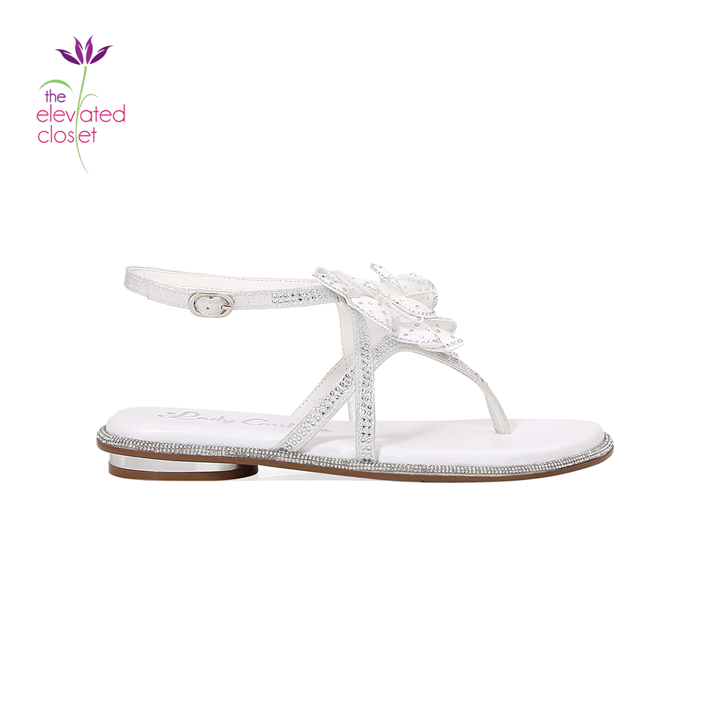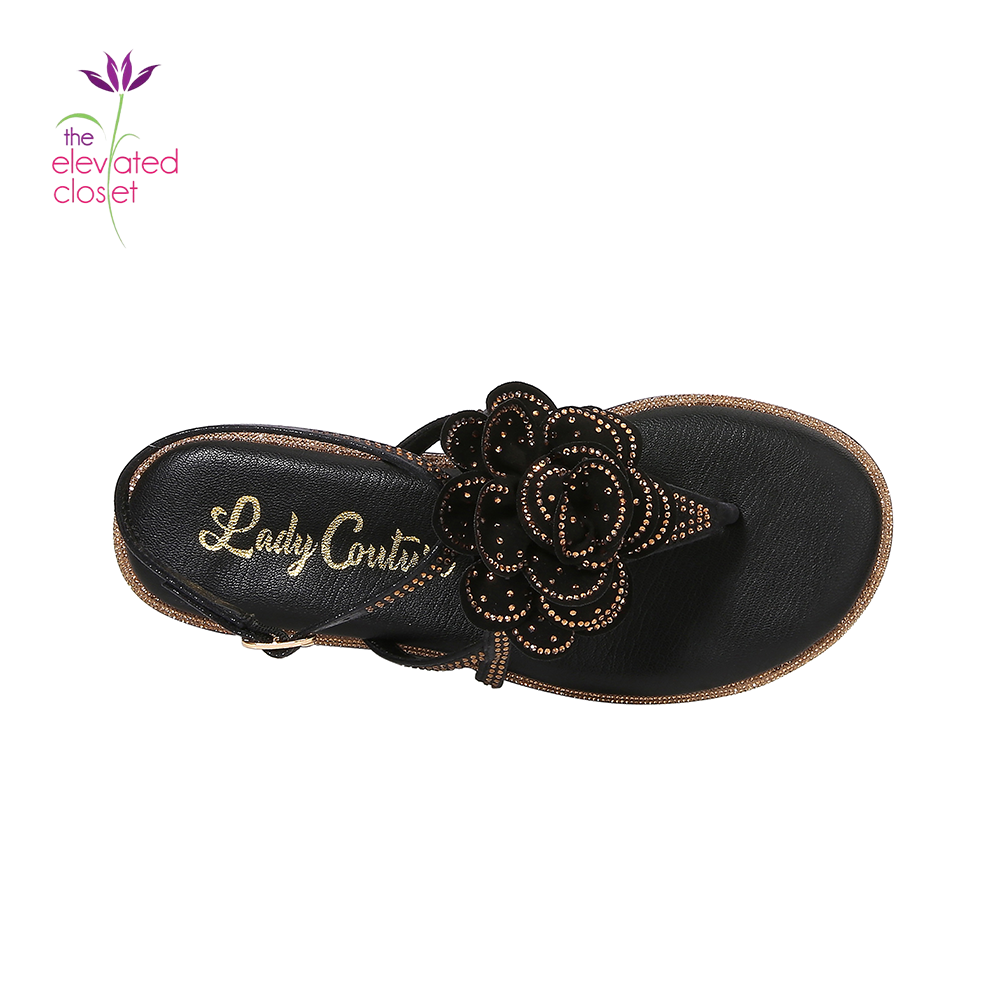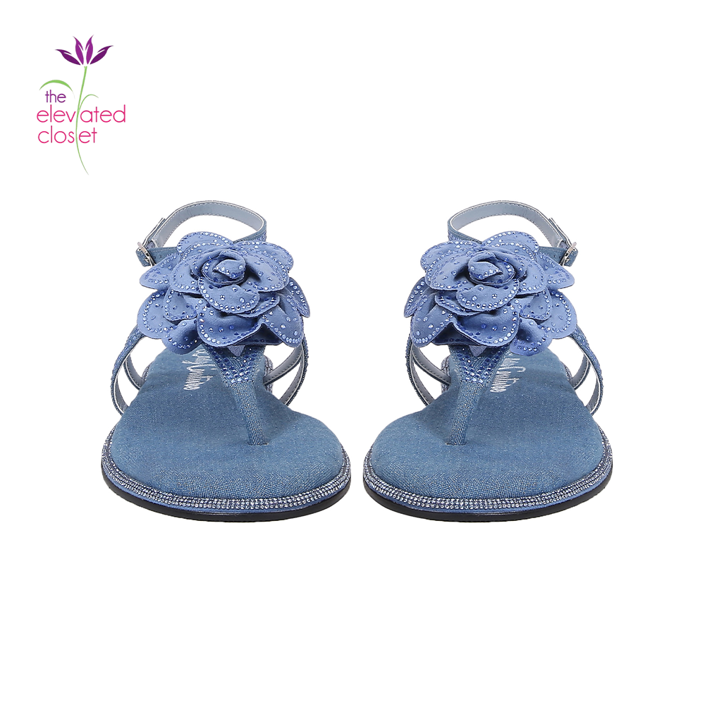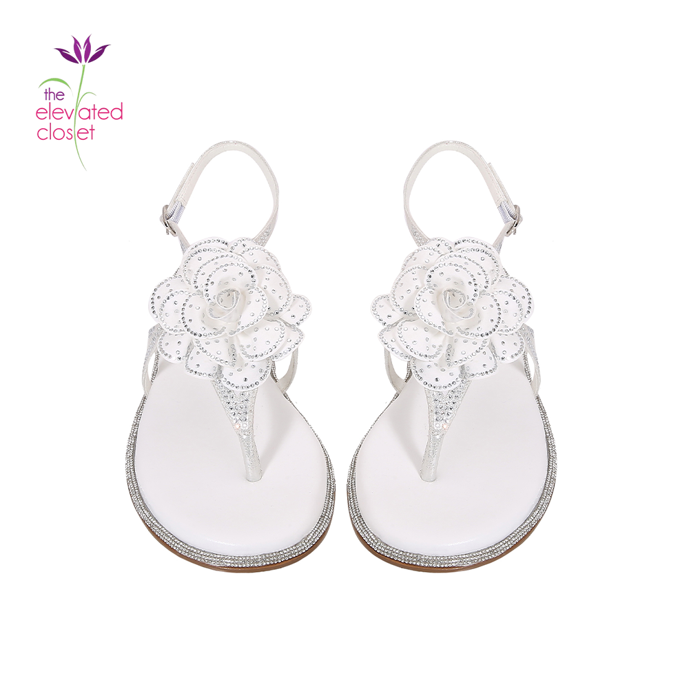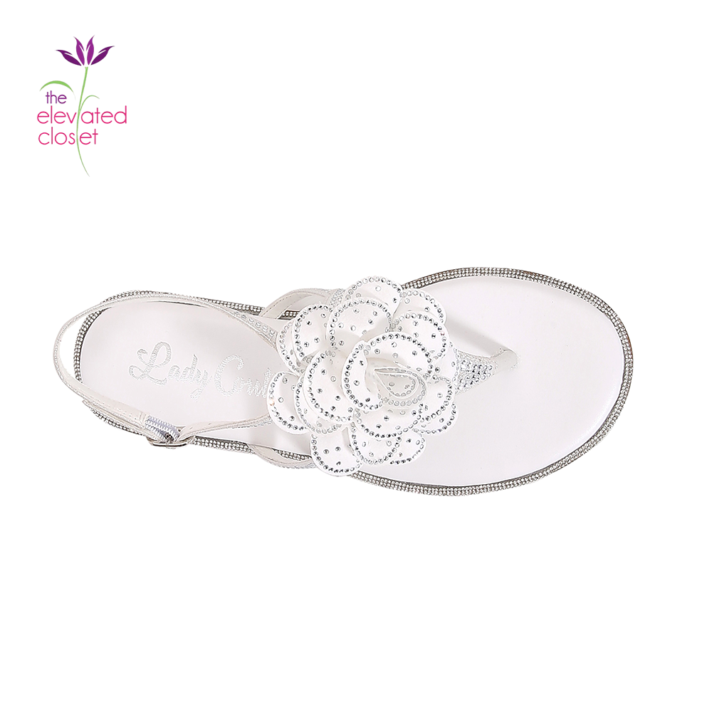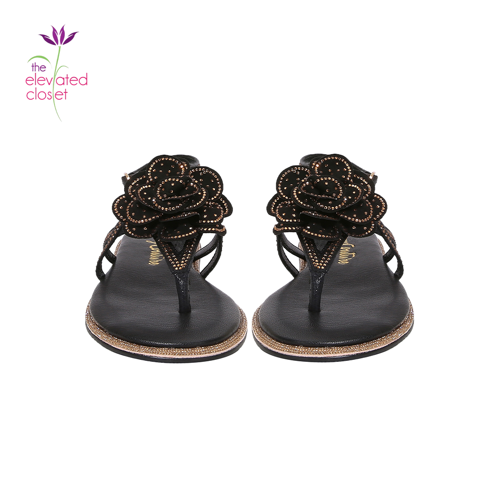 Complement your style with some flower power! This strappy silhouette features elegant rhinestone embellishments and an oversized floral accent on top.