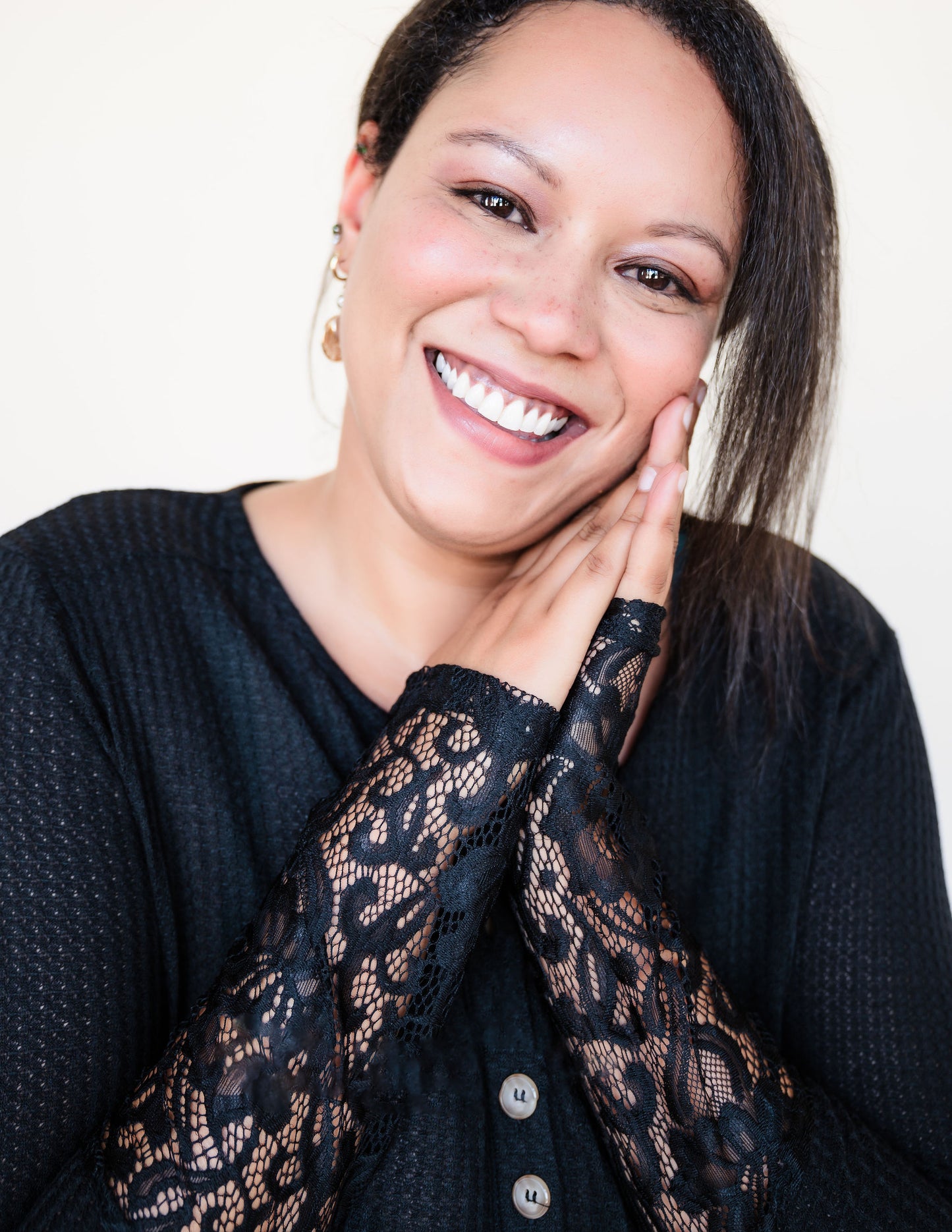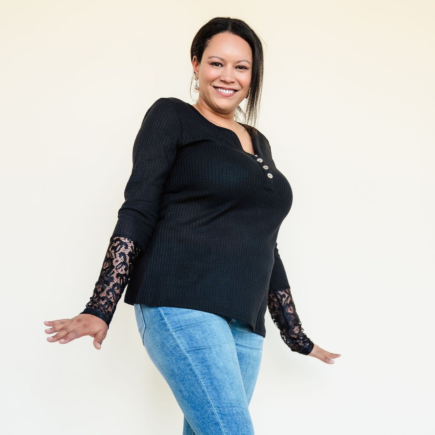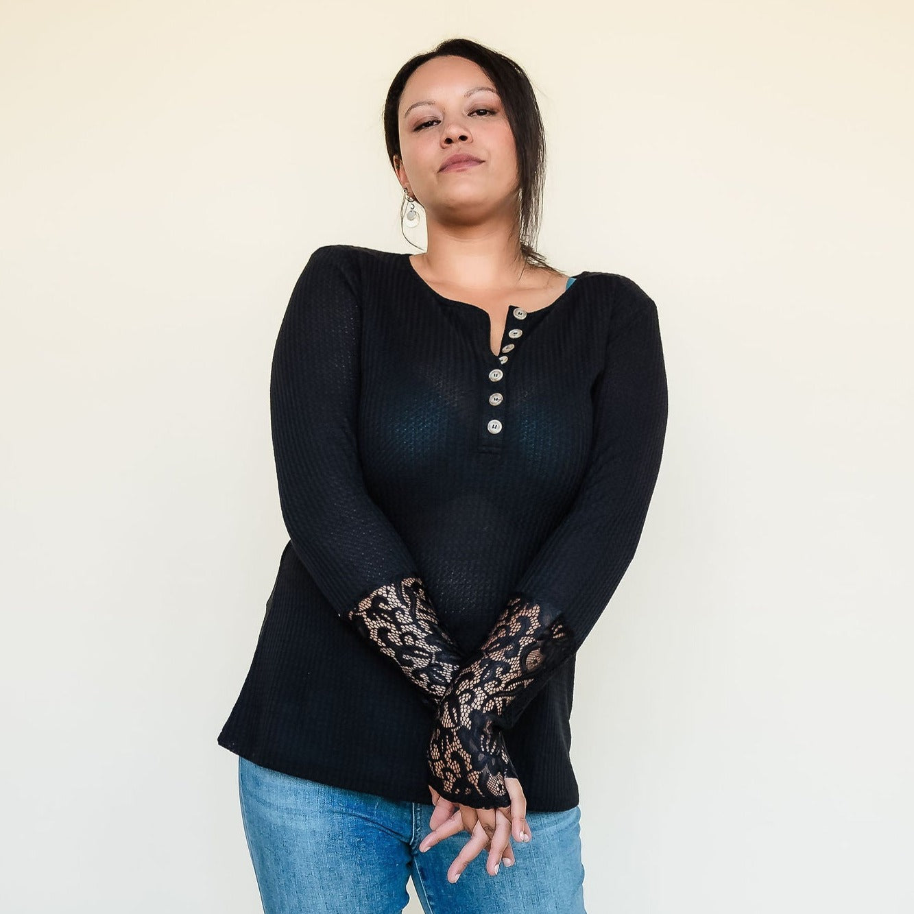The soft lace detailing on the sleeves adds a feminine touch and a hint of edge to your outfit. Whether you're dressing up or keeping it casual, the Henley neckline gives you the freedom to switch up your look effortlessly.